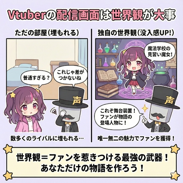 その場合、配信画面のデザインも、背景を「魔女の研究室」や「魔法図書館」のようなイラストにすることで、視聴者は一瞬であなたの世界に没入できるでしょう。
