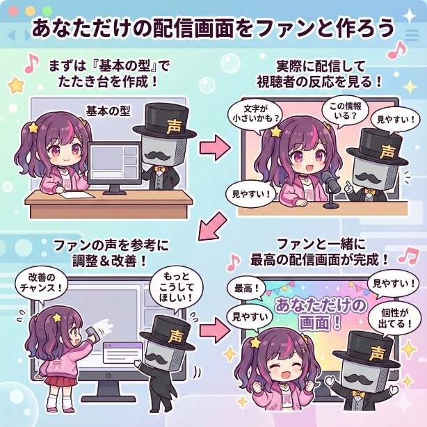 この記事をきっかけに、まずはあなたの第一歩を踏み出してみてください。試行錯誤を楽しみながら、ファンと一緒にあなただけの最高の配信画面を作り上げていきましょう。