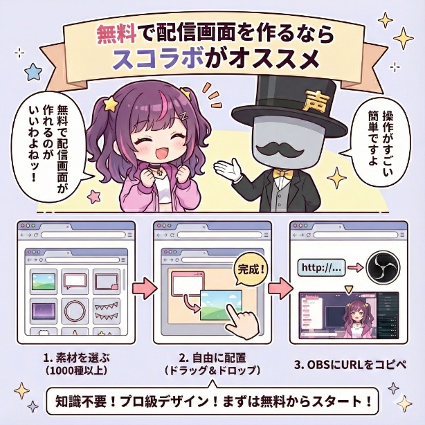 「お金をかけずに、今すぐおしゃれなVtuber配信画面を作りたい!」という悩みを抱えているなら、無料の配信画面作成ツール『スコラボ』が最適解と言えるでしょう。