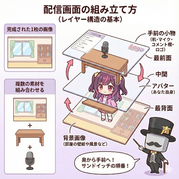 例えば、アバターの手前に「机」や「マイク」の画像を重ねることで、まるで本当にその部屋に座って配信しているような「奥行き」が生まれます。