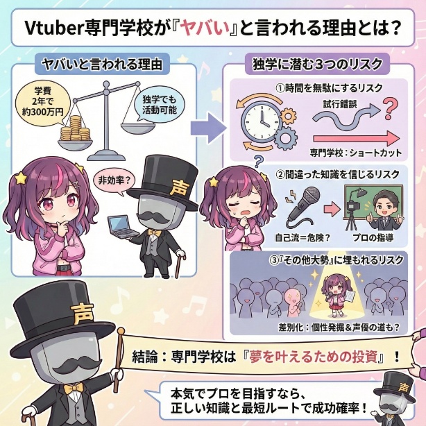 このように、主に「Vtuberは独学でも学べるのに、わざわざ高い学費と長い年月を掛けて勉強するのが非効率」な部分がヤバいと言われる理由だと考えれます。