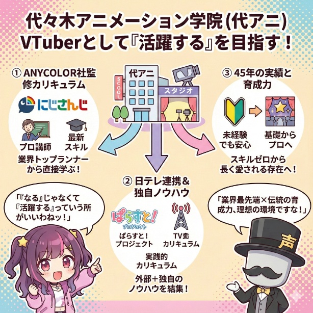 本気で「VTuberとして活躍する」ことを目指すなら、代々木アニメーション学院(通称:代アニ)は最も有力な選択肢の一つです。