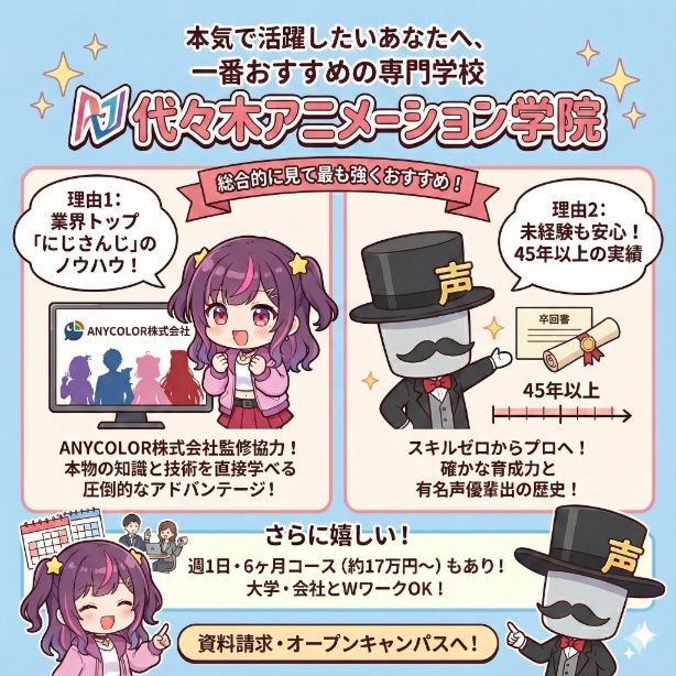 「最先端」だけでは、不安に感じるかもしれません。しかし、代々木アニメーション学院は、これまで何人もの有名声優をスキルゼロの状態から育て上げてきた、45年以上の歴史と育成ノウハウを持っています。VTuberに不可欠なトーク力や表現力の基礎を、この実績ある環境で学べることは、あなたの将来にとって大きな安心材料となるでしょう。