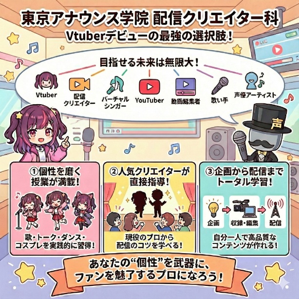したがって、数多くいるVTuberの中で突き抜けたいと考えるなら、Vtuberだけではなく配信者として幅広い知識を学べる東京アナウンス学院は、あなたの武器を鋭く磨き上げてくれる場所です。