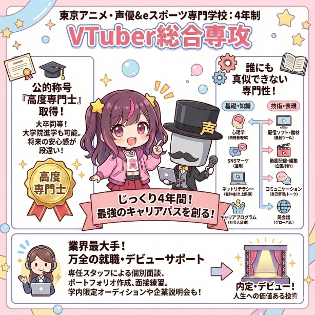 「大学卒業レベルの学歴と、プロとして通用する最上級のスキルを両立させたい」と考えるなら、東京アニメ・声優&eスポーツ専門学校の4年制「VTuber総合専攻」が、他の追随を許さない唯一無二の選択肢です。