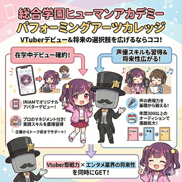以上のことから、総合学園ヒューマンアカデミーは、「VTuberとしての即戦力」と「エンタメ業界で広く活躍できる将来性」を同時に手に入れられる学校だと言えます。