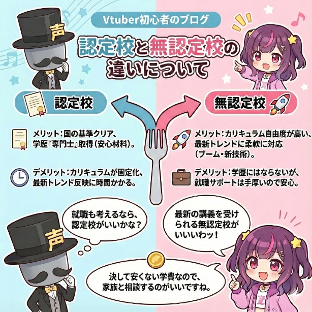 VTuberを目指して専門学校を選ぶなら、まず「認可校」と「無認可校」の違いを理解し、自分の目標に合う方を選ぶことが、後悔しないための最も重要なポイントになります。