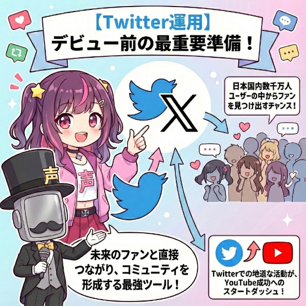 Vtuberデビュー準備において、YouTubeチャンネルの次に最優先で取り組むべきは、Twitter(現X)の運用です。デビュー前のこの期間をどう活用するかで、あなたのスタートダッシュの勢いが大きく変わるといっても過言ではありません。