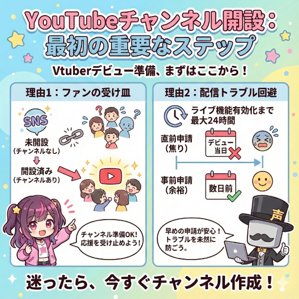 このように、YouTubeチャンネルの早期開設は、ファン獲得のチャンスを確実に掴み、配信トラブルを防ぐという2つの重要な意味を持ちます。