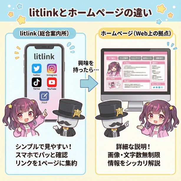 そのため、当サイト(声すた!)ではlitlinkとホームページの両方の利用をオススメします。