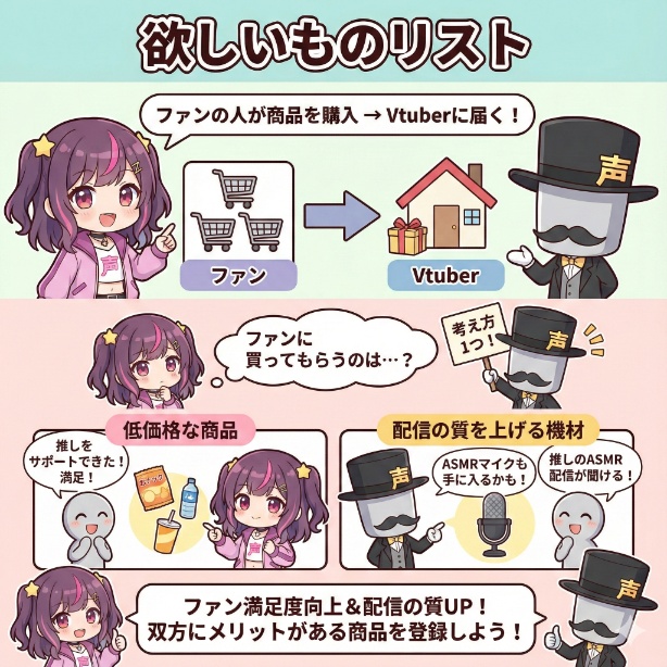 そういう時に、欲しいものリストを利用することでASMR専用マイクを手に入れられる可能性がありますし、ファンの人は推しのASMR配信が聞けるという双方にメリットがあります。