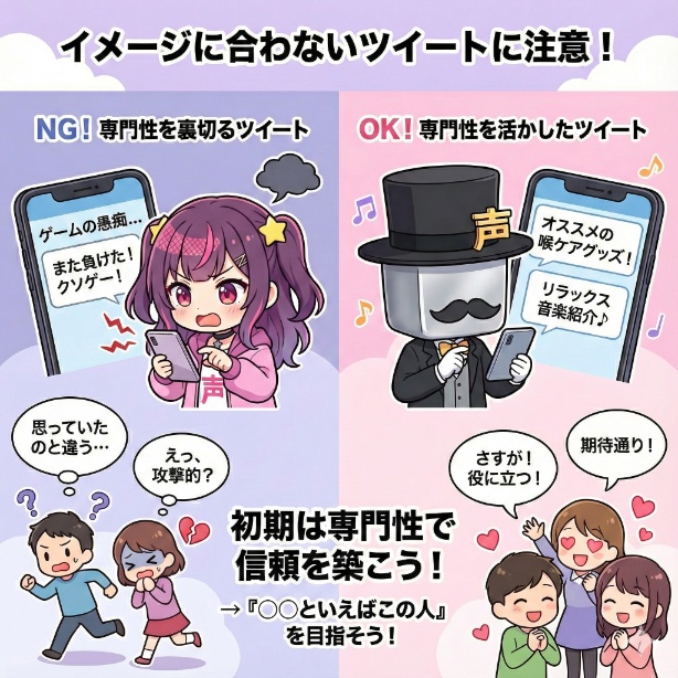 新人Vtuberがファンを増やす初期段階においては、あなたの専門性やキャラクターイメージと一貫性のあるツイートを徹底することが、信頼を築くための最も確実な方法です。