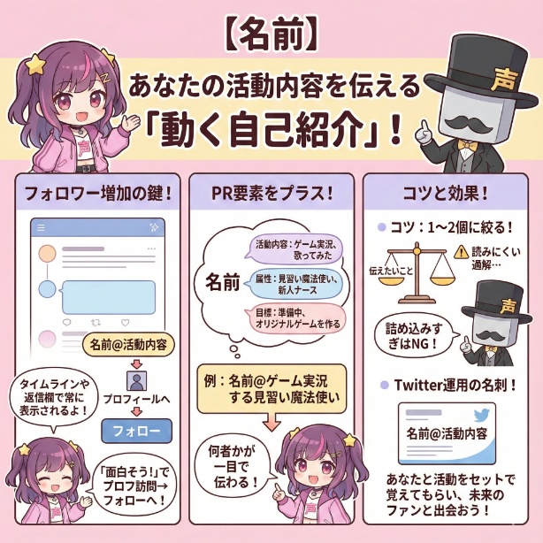 これらを組み合わせることで、「名前@ゲーム実況する見習い魔法使い」のように、あなたが何者であるかが一目で伝わるようになります。