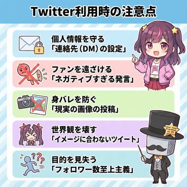 Vtuberが特に注意すべき「守り」のポイントは、主に以下の5つに集約されます。これらは、あなたのTwitter運用の土台となるルールだと考えてください。