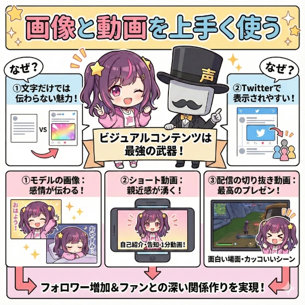 文字だけでは伝わらないあなたの魅力を届け、フォロワー数の増加とファンとの深い関係作りを同時に実現するために、積極的に活用してください。