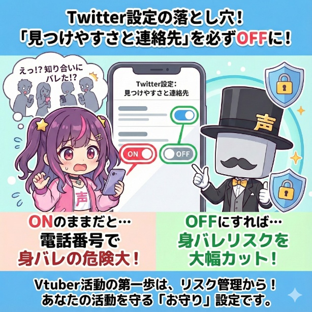 Vtuberとして活動を始めるなら、個人情報を守るための最初の一歩として、アカウント作成後すぐにTwitterの「見つけやすさと連絡先」設定を必ず見直してください。