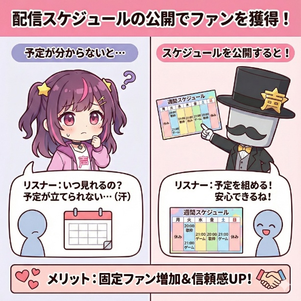 というのも、どれだけあなたのことが気になっているリスナーでも、事前に「いつ配信があるか」が分からないと、学校や仕事の合間を縫って配信を見に行く予定を立てられないからです。