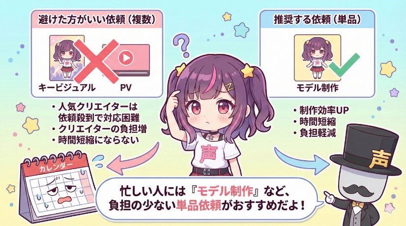 有名なクリエイターなど、忙しい人に依頼する場合は、キービジュアルやティザーPVなど複数の依頼は避けた方がいいかもしれません。