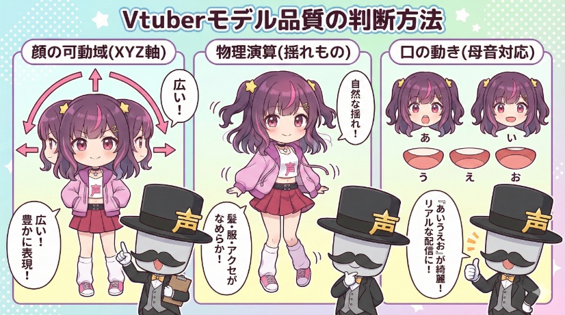 頭の動きに合わせて、髪や服、アクセサリーが自然に揺れているか。動きが硬かったり、体が突き抜けたりしていないかを確認しましょう。 - 口の動き(母音対応)