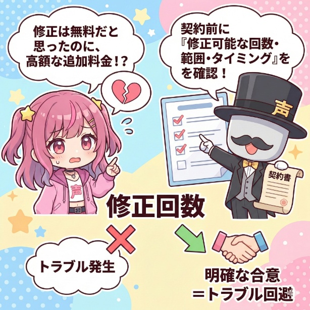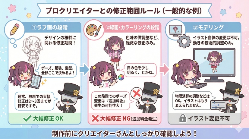 他にも、表情差分の内容や修正回数の上限など、事前に確認すべき点は多岐にわたります。