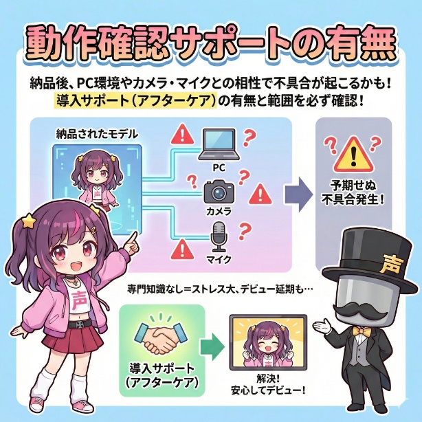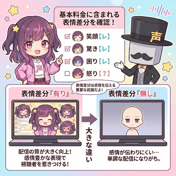 しかし、「当然ついていると思っていた表情が、実は高額なオプションだった」という金銭トラブルや、「いざ配信を始めたら表現力が足りず、面白いリアクションができなかった」という後悔を避けるために、事前の確認が不可欠です。