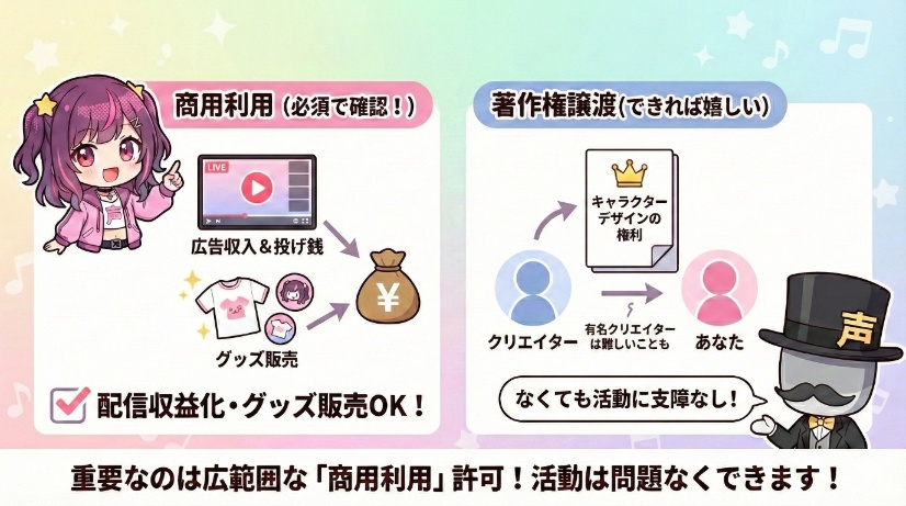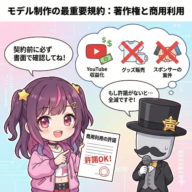 例えば、完成したモデルの著作権が誰に帰属するのか、グッズ販売などの「商用利用」は可能か、といった権利関係を確認しておかないと、せっかく人気が出ても収益化の道が閉ざされてしまうかもしれません。