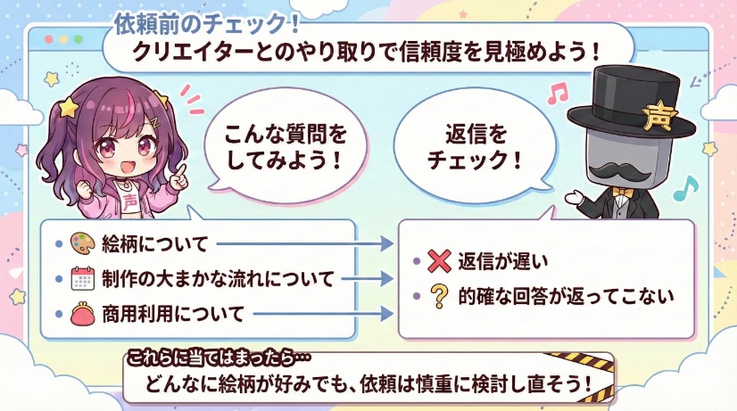 だからこそ、悪質なクリエイターに騙されず、心から信頼できるパートナーを見つけるために、これから解説するポイントを一つひとつ確認していきましょう。