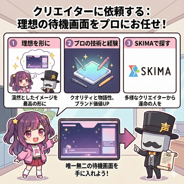 このようにクリエイターへの依頼は、時間と手間を節約しつつ、他の誰とも被らない高品質な待機画面を手に入れるための最良の選択肢です。