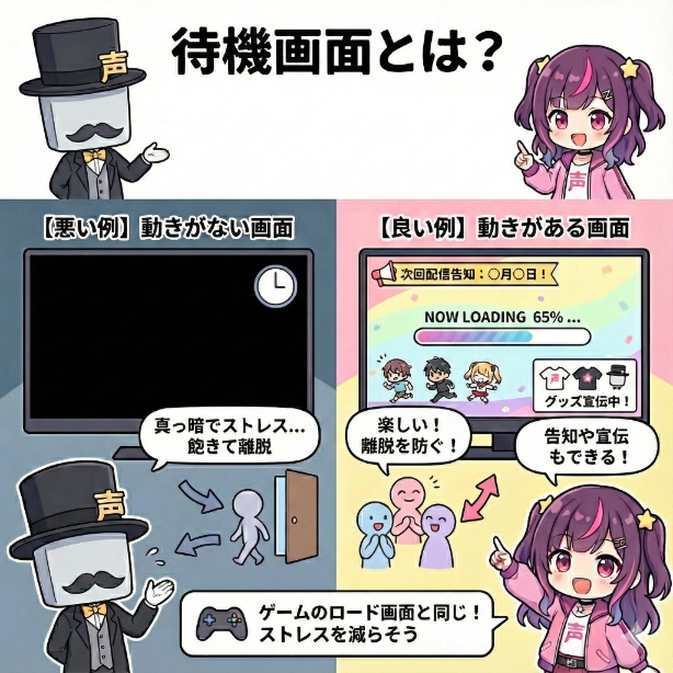 なぜなら待機画面を用意することで、トイレ等で一時的にその場から離れている待ち時間でも、視聴者を飽きさせないことができるからです。