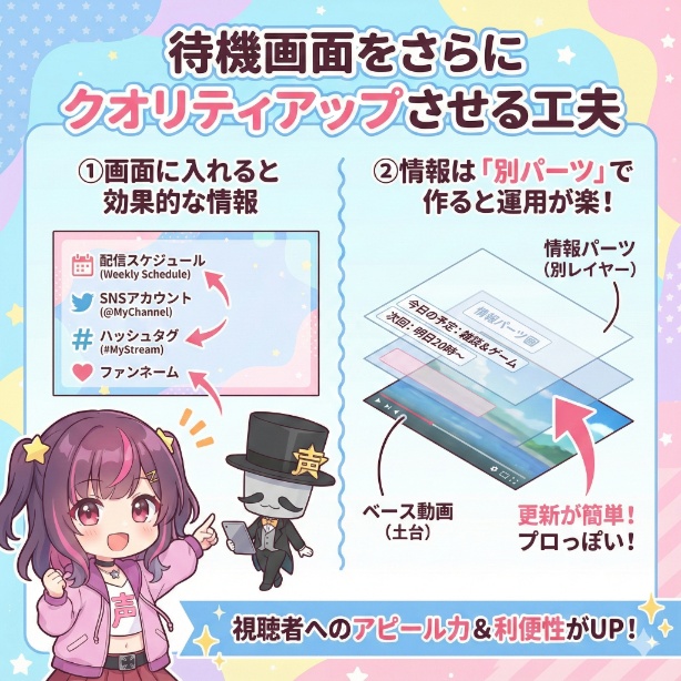 ただ映像を流すだけではなく、戦略的に情報を配置したり、更新しやすい作り方をしておくことで、プロの配信者のような「機能的で飽きさせない画面」に近づけます。