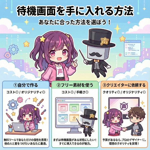 なぜなら、活動を始めたばかりのVtuberさん一人ひとり、使える時間やお金、そして「どんな待機画面にしたいか」という目的は異なるからです。