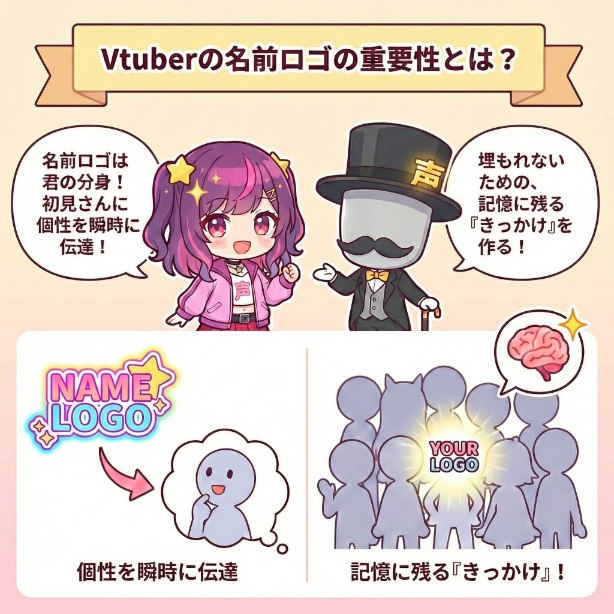 なぜなら、名前ロゴはあなたの分身として、初見の視聴者に名前と個性を瞬時に伝えてくれるからです。現在、VTuberの数は2万人以上おり、その中で埋もれてしまわないためには、視聴者の記憶に残り、あとで思い出してもらう「きっかけ」を作ることが極めて重要になります。