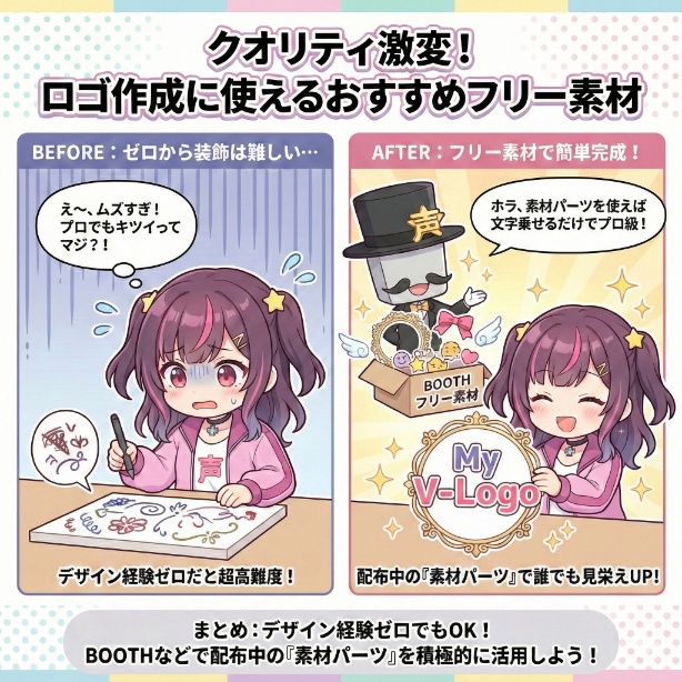 自作ロゴのクオリティを引き上げたいなら、BOOTHなどで配布されている「フリー素材」を積極的に活用しましょう。