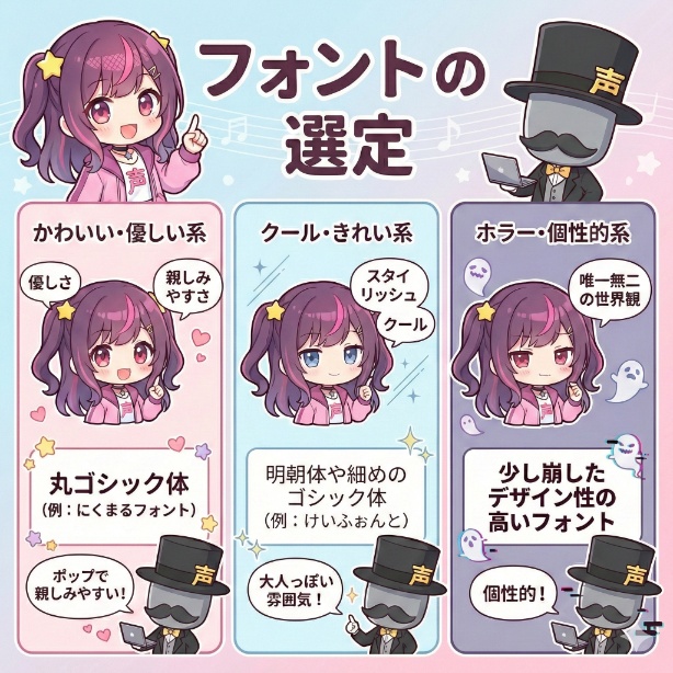 明朝体や細めのゴシック体(例:「けいふぉんと」のようなスッキリした文字)は、スタイリッシュで大人っぽい雰囲気を演出できます。 - ホラー・個性的系なら: 少し崩したデザイン性の高いフォントを選ぶと、唯一無二の世界観を表現可能です。