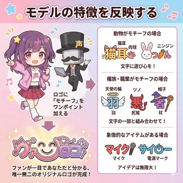ロゴにあなたのアバターが持つ「モチーフ」をワンポイント加えることで、ファンが一目であなただと分かる、唯一無二のオリジナルロゴが完成します。