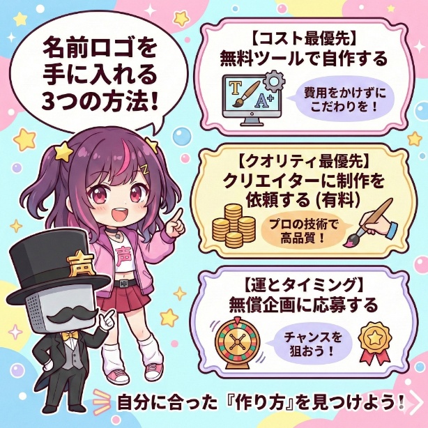 クオリティの高い名前ロゴを手に入れる方法は、一つだけではありません。あなたの予算やスキル、かけられる時間に合わせて、最適な方法を選ぶことができます。
