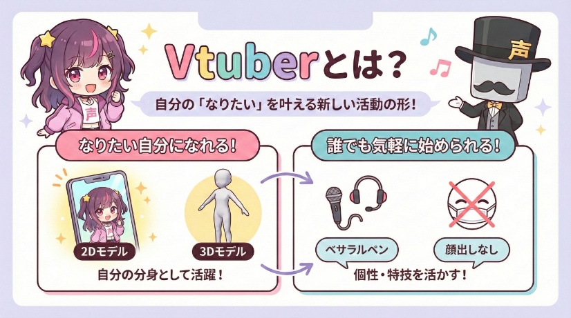 Vtuberとは、自分の「なりたい」を叶える新しい活動の形であり、2Dや3Dのモデル(自分の分身となるキャラクター)を使ってインターネット上で活躍する配信者のことです。