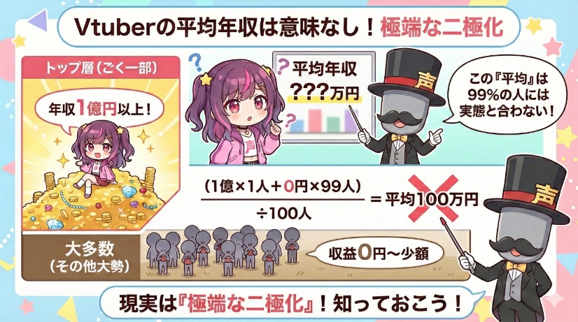 Vtuberを目指すなら、まず知っておいてほしい現実があります。それは、一般的な「平均年収」という数字は、Vtuberの世界ではほとんど参考にならないということです。