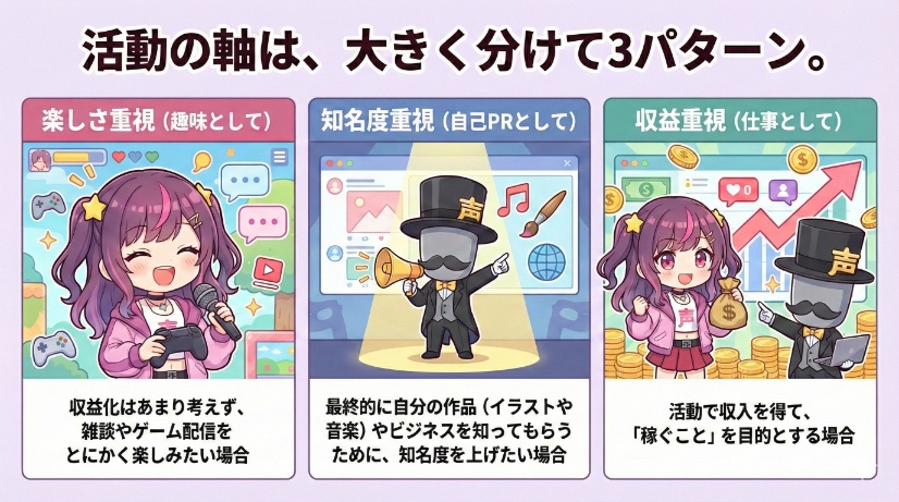 この記事では、特に「③ 収益重視」に焦点を当て、「Vtuber活動で稼ぐこと」を目標にした場合の具体的ななり方について、この後1つずつ徹底的に紹介していきます。