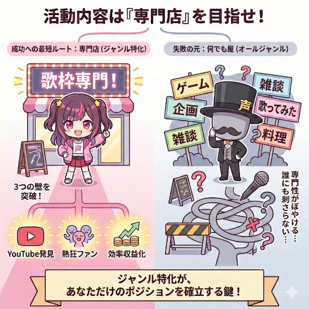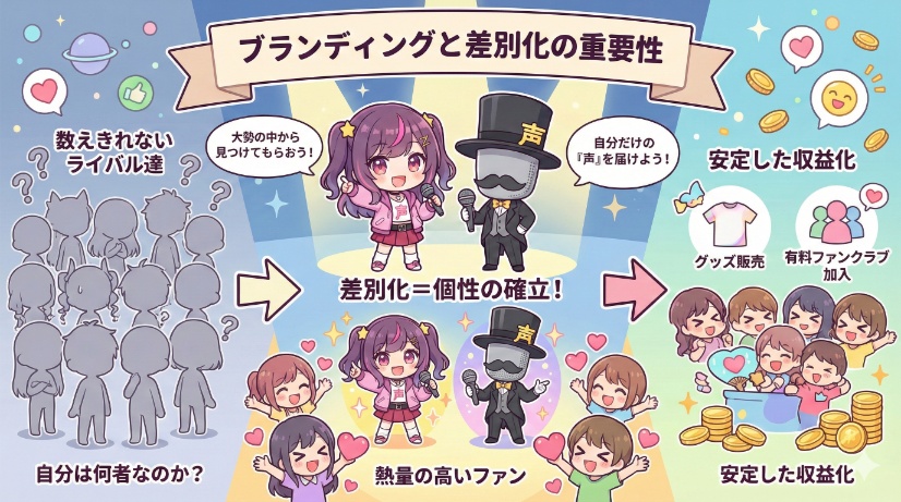 厳しいVtuber業界で「稼ぐ側」に入るためには、「自分は何者なのか」をハッキリさせるセルフブランディングと、「他の人との違い」を打ち出す差別化が絶対に必要です。