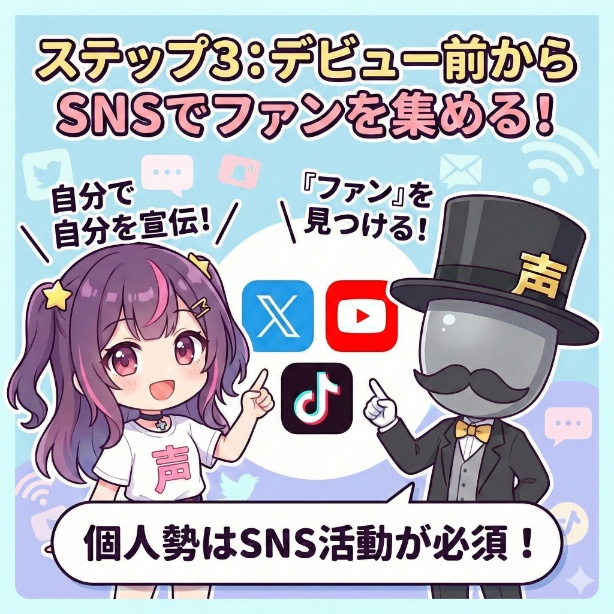 デビュー前からX(旧Twitter)などSNS運用に力を入れ、戦略的にファンを集める必要があります。