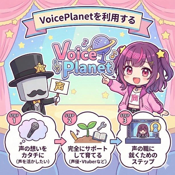 Voice Planet(ボイスプラネット)は「声を活かしたい」「声優になりたい」という想いをカタチにし、育てていくプロジェクトになります。