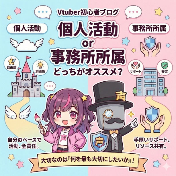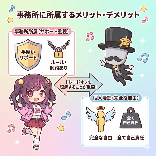 なぜなら、事務所は強力なサポートを提供してくれる代わりに、活動には一定のルールや制約が伴うからです。逆に、個人活動は全てが自己責任ですが、完全に自由な表現ができます。