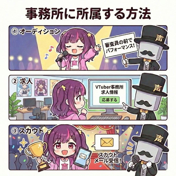 Vtuber事務所に所属する場合は以下3つの方法があります。