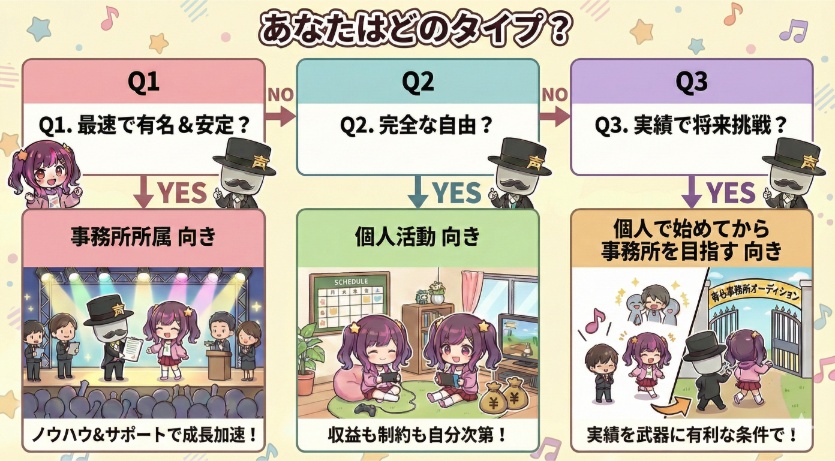 手厚いサポートのもと最速で人気者を目指したいなら事務所、自分のペースで好きなことを貫きたいなら個人活動が、それぞれ向いていると言えるでしょう。