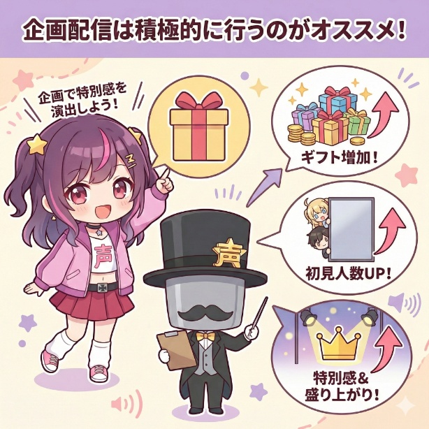 この「安定(定期)」と「刺激(企画)」をバランス良く組み合わせることこそが、長く愛される人気ライバーへと繋がっていきます。