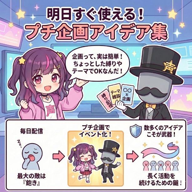 なぜなら、毎日配信を見に来てくれるリスナーにとって最大の敵は「飽き」であり、数多くのアイデアを持っていることこそが、長く活動を続けるための最大の武器になるからです。