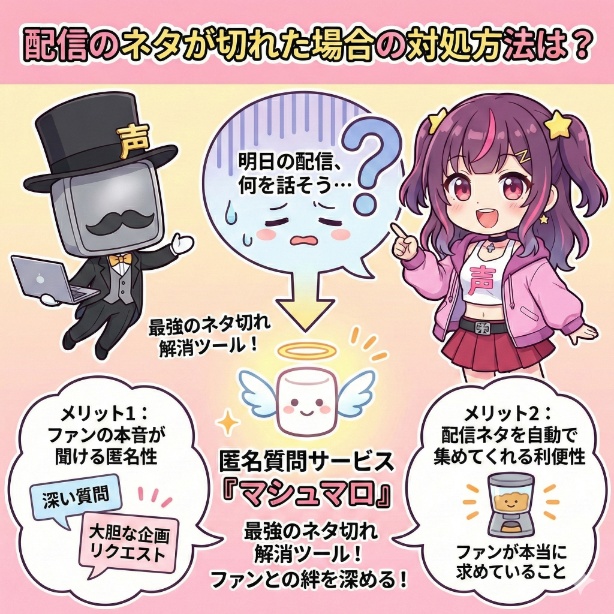 「明日の配信、何を話そう…」と頭を抱えてしまった時、絶対に導入すべきなのが、匿名質問サービス「マシュマロ」です。