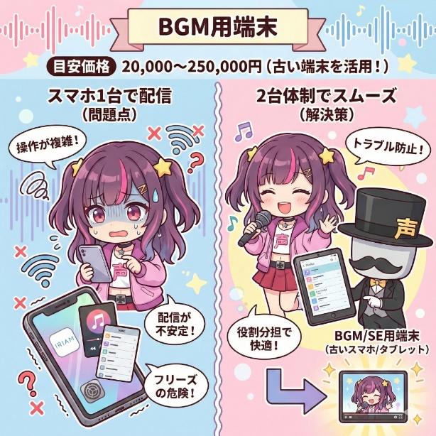 IRIAM配信の雰囲気を盛り上げるために、BGMや効果音(SE)を流す専用の端末を用意しましょう。まずは、以前使っていた古いスマートフォンやタブレットを機材として活用するのがおすすめです。