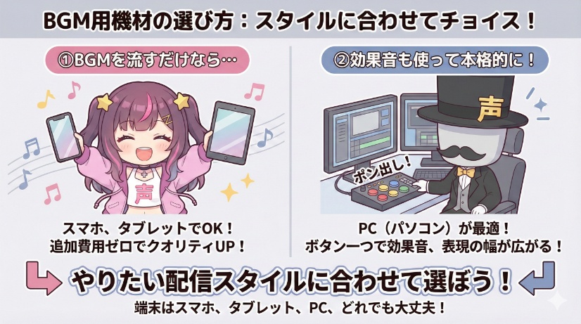 さらに、効果音も使って本格的な配信を目指すなら、PC(パソコン)が最適です。PCなら、ボタン一つで効果音を鳴らす「ポン出し」が簡単にでき、表現の幅が大きく広がるでしょう。